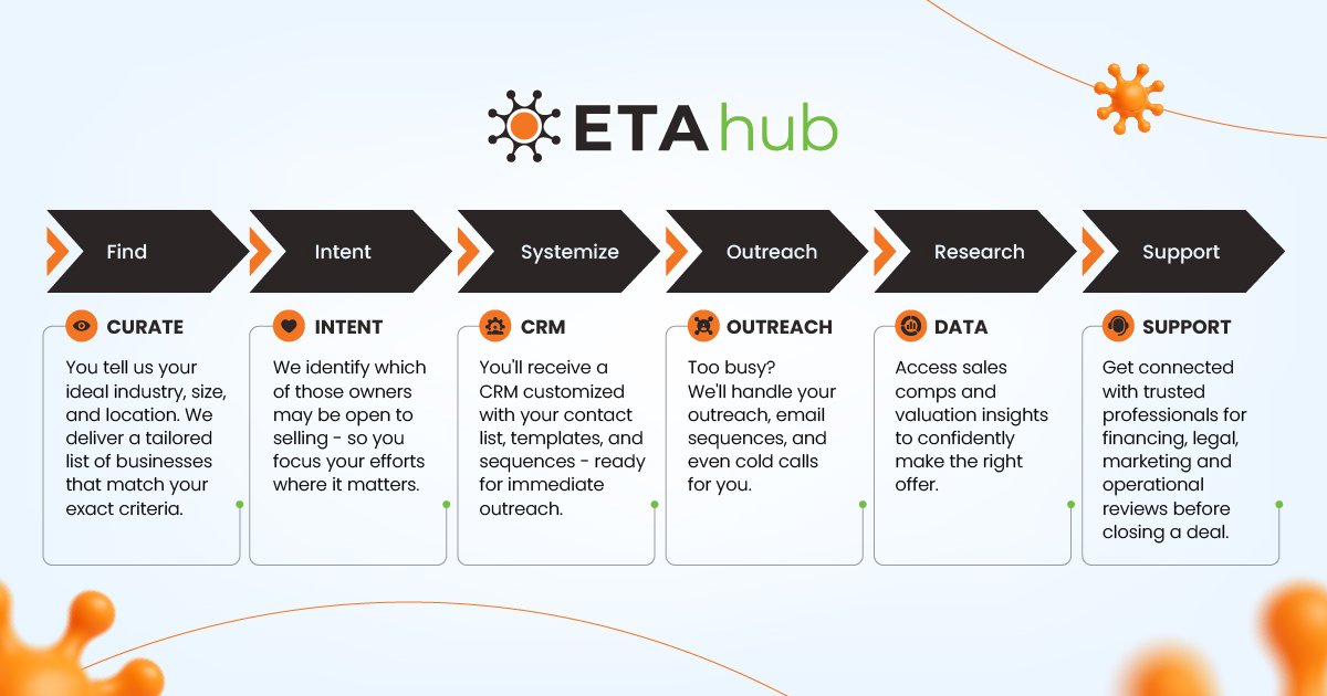 We are searchers too. We know the frustration of scouring the listing sites trying to find a good deal.... knowing that thousands of others are doing the exact same thing. We also know the frustration of trying to track down a list and spending days cold-calling or hundreds of dollars emailing only to get a 1% engagement. We built ETAhub as our in-house deal-flow. We started selling access beacuse we had the access to a ton of information that we just weren't using. Now, we get to help our fellow searchers meet their goals.